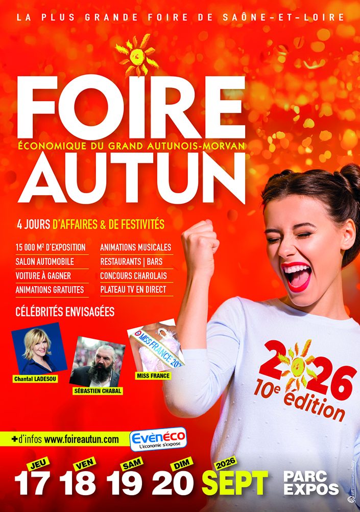 Toute l’équipe d’Evènéco prépare dès maintenant la Foire de l’Autunois-Morvan, plus grande foire de Saône-et-Loire, qui aura lieu sur 4 jours, les 17, 18, 19 et 20 septembre 2026. Des animations inédites et des invités incroyables. Des artisans et commerçants principalement d’ici et un peu d’ailleurs. Des évènements agricoles au cœur de la foire. 12 000 m2 repensés entre les stands dans le Parc des expos ou dans le chapiteau, les espaces extérieurs pour l’automobile, l’agricole ou le plein air et les stands marchands forains. Des milliers de visiteurs attendus dans les allées, venus de Saône-et-Loire, de la Nièvre et de la Côte-d’Or...